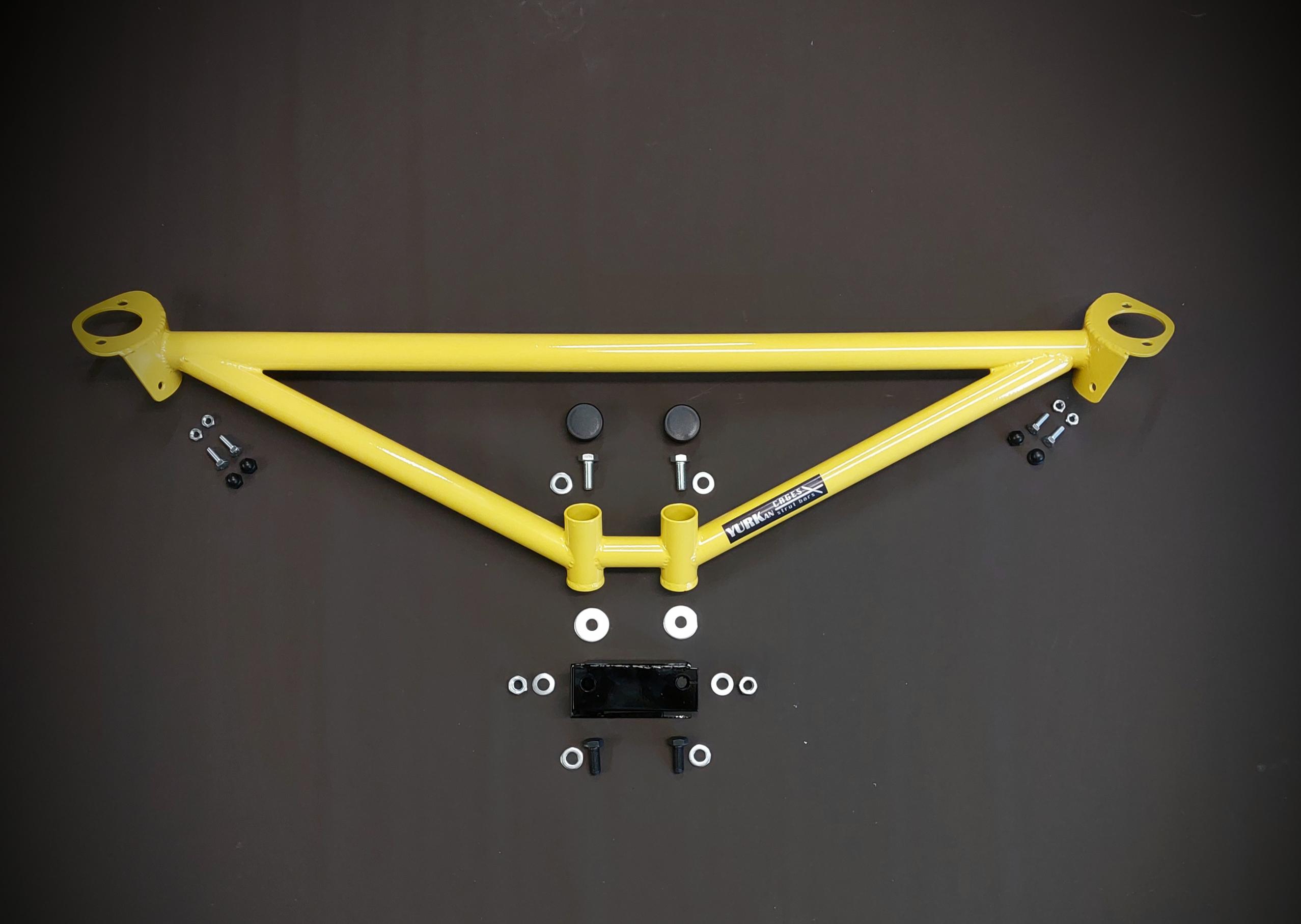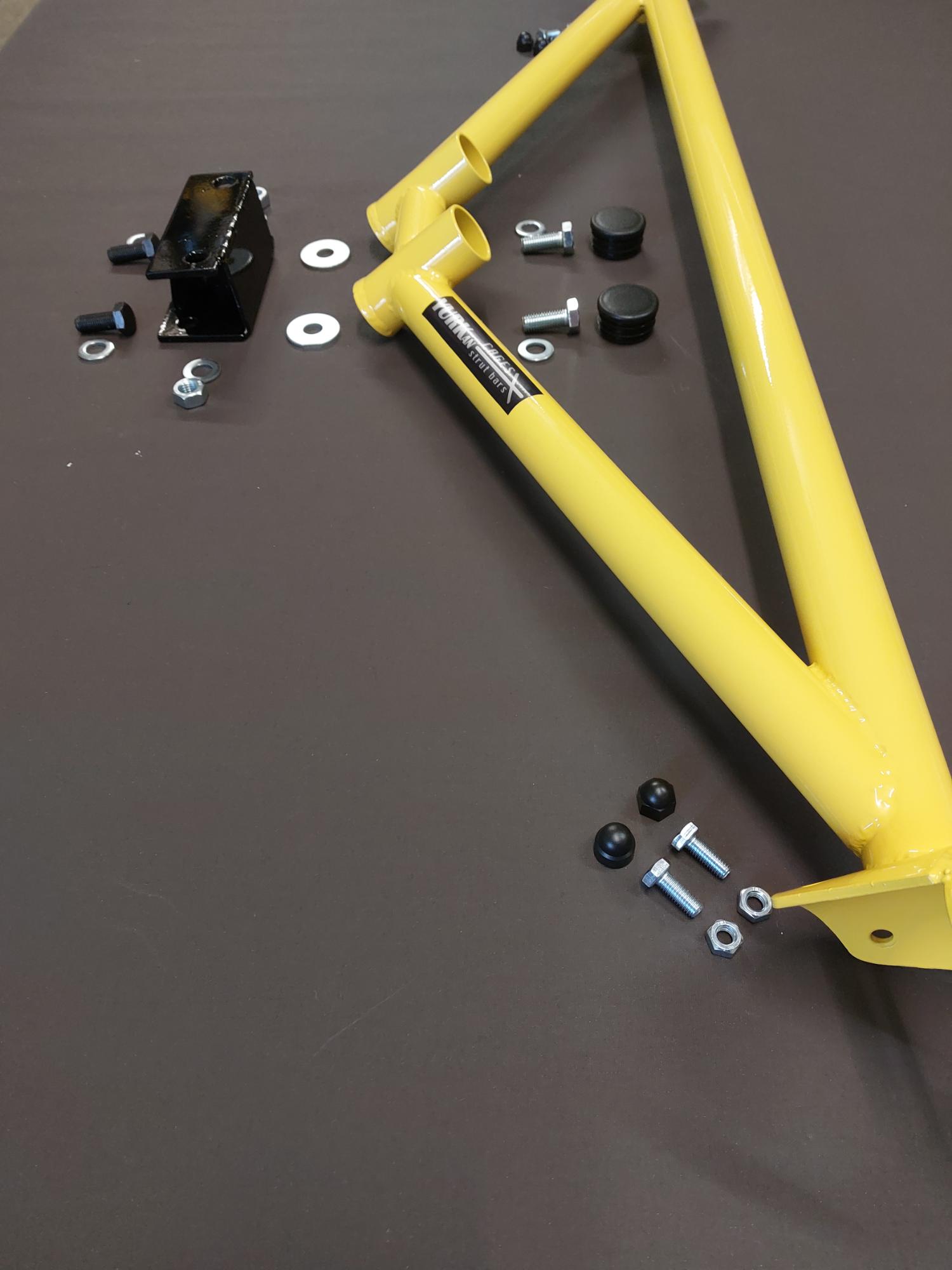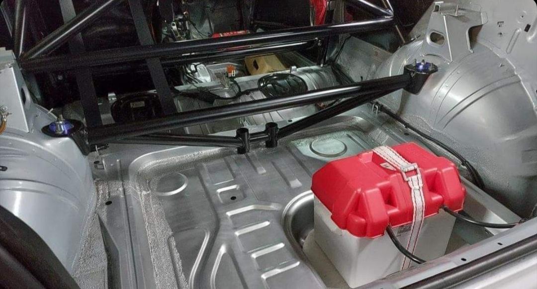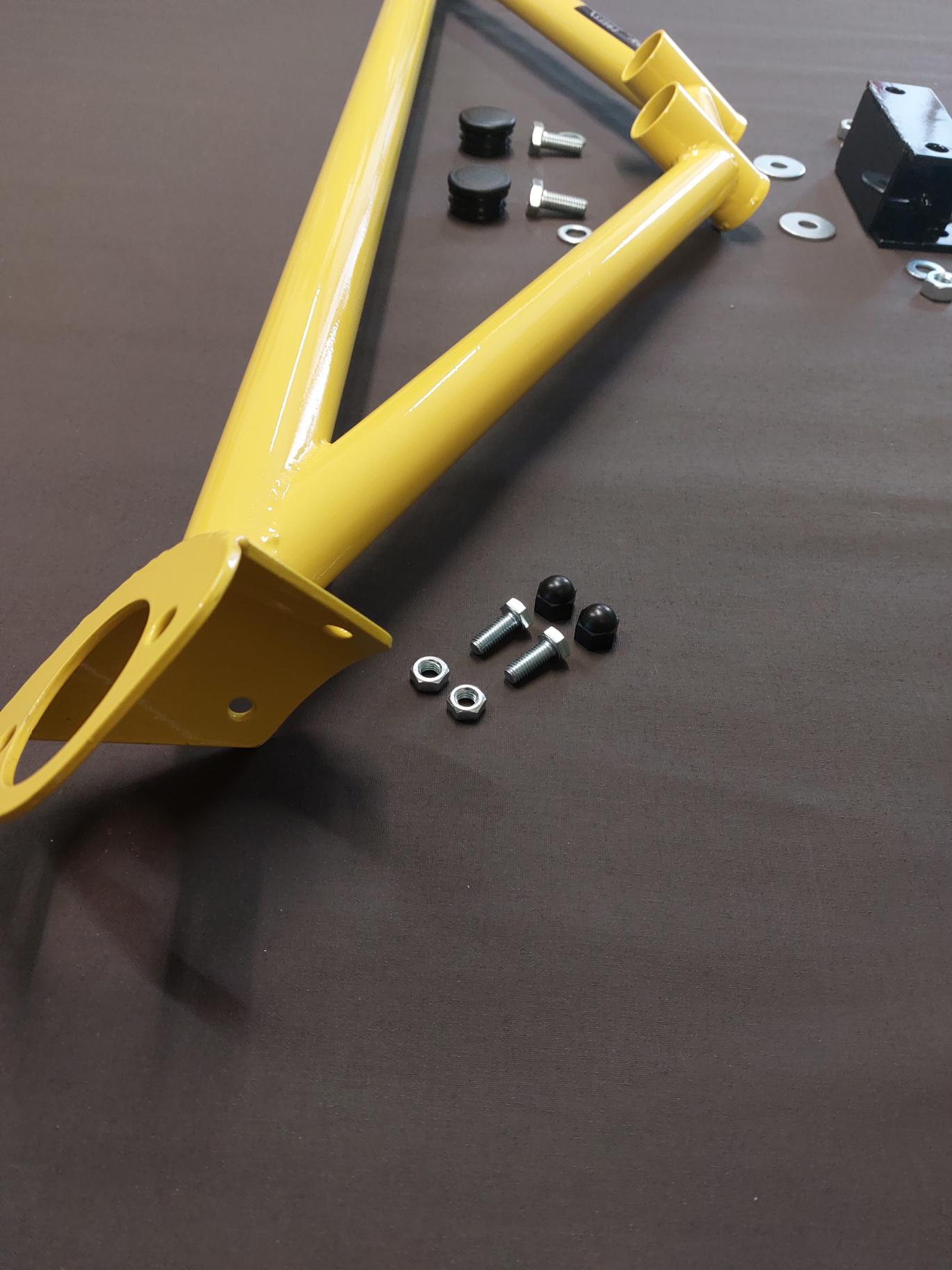 The fully bolted brace reinforces both the rear axle and the strut tower mounts.